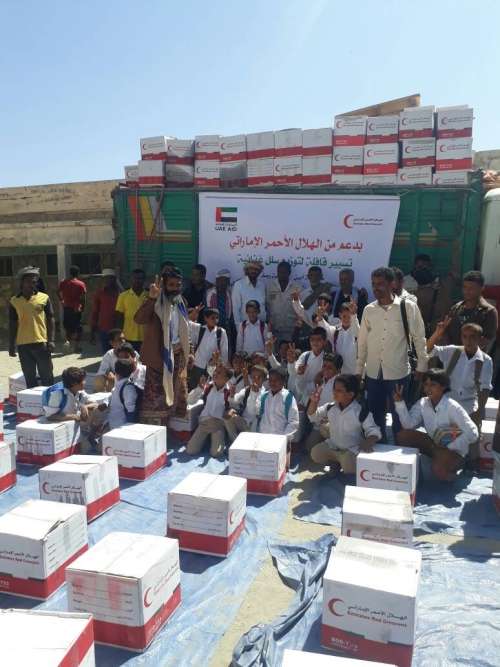 دشن الهلال الأحمر الإماراتي صباح اليوم توزيع 7500 سلة غذائية في مديرية يافع رصد محافظة أبين.
