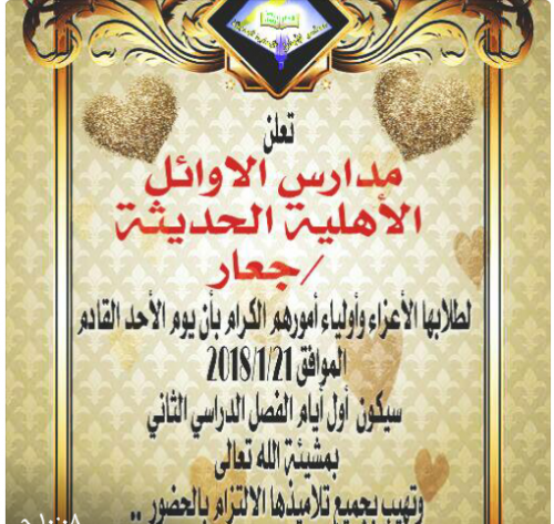 مدارس الأوائل بجعار تعلن لطلابها ان غدا الأحد أول أيام الفصل الدراسي الثاني
