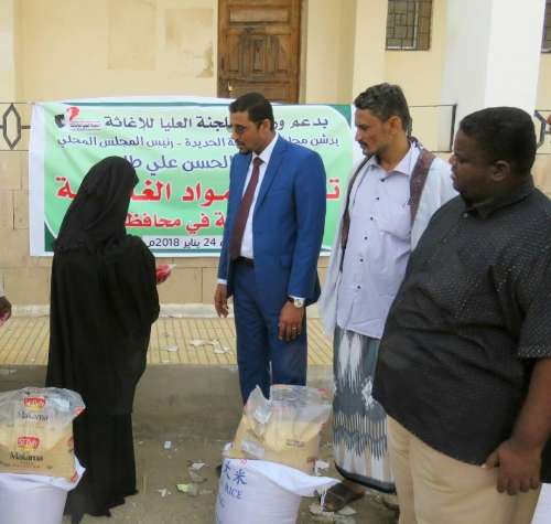 بدعم من اللجنة العليا للاغاثة وبرعاية الدكتور الحسن علي طاهر محافظ محافظة الحديدة دشن وكيل اول محافظة الحديدة الاستاذ وليد القديمي توزيع المواد الغذائية لنازحي تهامة في ثانوية حذيفة بن اليمان بمحافظة أبين.