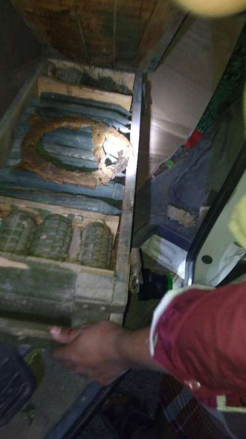 وعثر أفراد النقطة في داخل الباص على 60 شنطة رصاص دشكا و 3 صناديق ألغام بشرية حديثة و قوائم دشكا و شوالات فيها رصاص منوع معدل و آلي ومتفرقع.