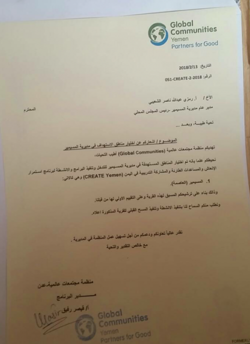 بناء على ترشيح مسبق من قبل مدير عام مديرية المسيمير محافظة لحج الأخ رمزي عبدالله ناصر تبدأ منظمة مجتمعات عالمية تدشين برنامجها الإنساني بالمسيمير العاصمة.