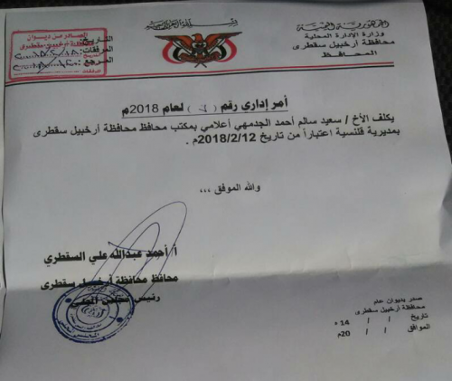 عين محافظ محافظة أرخبيل سقطرى الاستاذ أحمد عبدالله السقطري سعيد الجدمهي إعلاميا بمكتب المحافظة ومديرية قلنسية.