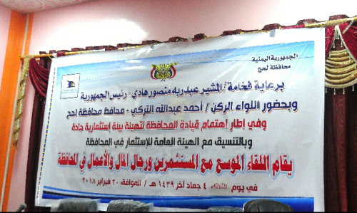 وفي بداية اللقاء رحب محافظ محافظة لحج التركي برجال المال والأعمال والمستثمرين في المحافظة وحثهم على فتح المجال للاستثمار وستقدم لهم السلطة المحلية كل التسهيلات والتعاون معهم في حل كل الاشكاليات والمعوقات التي تعيق عمل المشروع ، الى جانب تساهل بعض التجار والمستثمرين في دفع الضرائب للدولة دون اي مسوغ قانوني باستثناء بعض المستثمرين المتميزين .