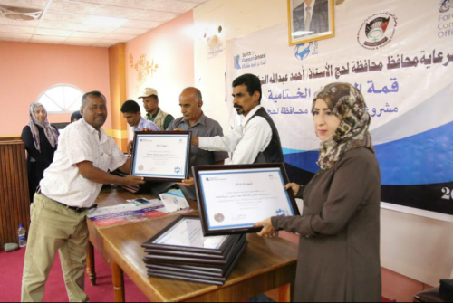 وقام كل من منسق مشاريع المنظمة في المحافظات الجنوبية/سماح يوسف، استشاري المشروع دكتور/هدى علوي، مدير عام مديرية "الحوطة" أنيس العُجيلي، ومدير عام مديرية "تُبن" محسن جعفر، بتكريم 60 وسيط محلي، بتوزيع شهادات شكر وتقدير وهدايا رمزية تحمل شعار المنظمة، كما تقدمت المنظمة بدرع تكريمي لمركز "المرأة" وشهادات شكر وتقدير لاستشاري المشروع دكتور/هدى علوي ومحافظ محافظة لحج/أحمد عبدالله التركي ومديريّ عام المديريتين ومدير عام المؤسسة المحلية للمياه - لحج/عبدالله الصعو، وذلك بحضور وكيل الشباب بالمحافظة/وضاح الحالمي، وكيل أول محافظة اللواء/صالح البكري، ومستشار المحافظ دكتور/أمين العلياني، إلى جانب جمع من زملاء وأهالي الوسطاء ونشطاء المجتمع المدني في لحج.