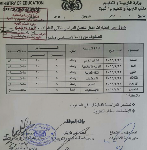 كما تبدأ الامتحانات النهائية للصفوف من السابع الى التاسع أساسي وذلك يوم السبت الموافق 28 ابريل 2018 ودعا التعميم الذي عممه مكتب التربية والتعليم بشبوة الجميع الى التقيد بالتعميم.