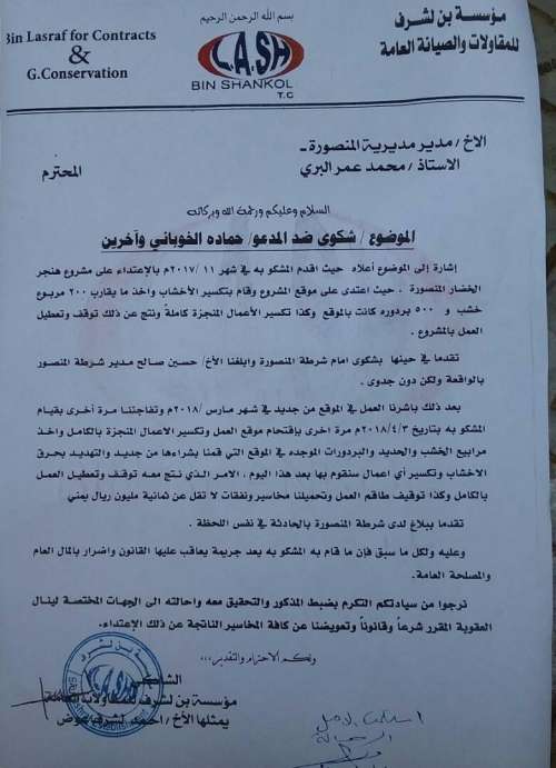 تم في الساعة السادسة صباحآ من يومنا الثلاثاء الموافق 3/ابريل/2018 أيقاف وتكسير ما تم انجازه من عمل في مشروع اعادة ترميم وتأهيل سوق المنصورة للسمك و الخضروات والفواكة في شارع القصر من قبل المدعو حمادة الخوباني ومجموعة مسلحة .