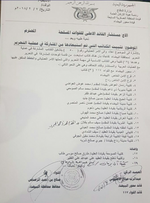 وأشار المصدر "بأن عمليات وقيادة التحالف في "مأرب" طالبتهم لأكثر من مرة في الزحف والتقدم بعد أن يتم تمشيط طيران التحالف لجميع مواقع العدو ، إلا أن قيادة اللواء وجدت نفسها في شر أعمالها ، موضحاً بالقول "بأن قوام القوه التي تقدمت بها قيادة اللواء إلى عمليات وقيادة التحالف في المعسكر قوامها 3500 ضابط و فرد بالإضافة إلى 19 كتيبة إلى جانب قوات الأمن الخاصة بفرعيها "البيضاء" و "رداع" .