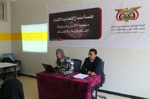 نفذت اللجنة الوطنية للتحقيق في ادعاءات انتهاكات حقوق الإنسان اليوم جلسة استماع علنية لعدد من ضحايا الألغام عرضت فيها صور الانتهاكات لوقائع زراعة الألغام ونتائج التحقيق التي قامت بها اللجنة الوطنية المتعلقة بزراعة الألغام في اليمن عامة وتعز خاصة وتحليل منهجية الأضرار التي مورست بحق الضحايا منذ مارس 2015م وحتى مارس 2018م وخلفت الكثير من الأضرار الجسدية والنفسية إضافة الى التبعات الاقتصادية والاجتماعية والبيئية لتلك الألغام.