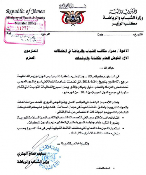 وجه وزير الشباب والرياضة نايف البكري مكاتب الوزارة في المحافظات والكشافة بالمشاركة الفاعلة في اسبوع المرور العربي الذي سيقام في الفترة من 4-10 من شهرمايو.