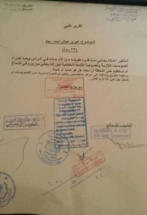 وناشدت المواطنة الحكومة وأهل الخير مساعدتها نقل زوجها للعلاج في مصر للتواصل ٧٧٥٨٣٩٧١٠..