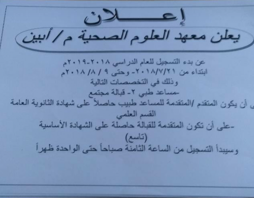 يعلن معهد العلوم الصحية بمحافظة أبين عن بدء التسجيل للعام الدراسي 2018 - 2019 م ابتداء من 2018/7/21 - 2018/8/9 م وذلك في التخصصات التالية :