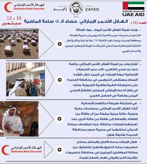 ضمن مشاريع النصف الثاني لعام زايد 2018 م وزعت هيئة الهلال الأحمر الإماراتي موادا إغاثية للنازحين من مديريات حيس والتحيتا والدريهمي إلى مديرية الخوخة بمحافظة الحديدة.