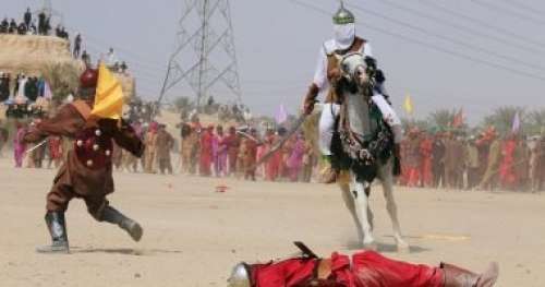 واحتشد ألاف العراقيين اليوم الخميس حول أحد الساحات لمشاهدة مشهد تمثيلى لقتل الحسين، بينما يصرخون حزنا على وفاة الإمام.