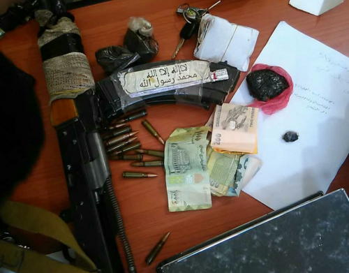 وأشار المصدر إلى أنه وعند تفتيش المتهم الذي يدعى (ب. م. ح. م) وسيارته عُثِرَ بحوزته على ربع كيلو من المخدرات (حشيش)، ثم بعد إجراء فحص خارجي من المُحقق المُكلَّف باستجوابه اتضح أن المسلح الموقوف كان في حالة تعاطي متعمقة للمادة المخدرة، كاشفاً ذات المصدر أن سلاح الإرهابي مطبوع عليه مُلصق يُشبه تماماً الملصقات التي كان يضعها تنظيم القاعدة على الأسلحة النارية لعناصره.