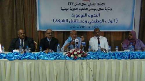 برعاية رئيس مجلس ادارة الخطوط الجوية اليمنية الكابتن / احمد مسعود العلواني / نظم الاتحاد الدولي لعمال النقل ItF ونقابة عمال وموظفي الخطوط الجوية اليمنية ، اليوم ، بالعاصمة المؤقتة عدن ندوة توعوية بعنوان الولاء الوظيفي ومستقبل الشركة ، بحضور نائب المدير العام لشؤون المالية بالخطوط الجوية اليمنية / عادل العطاس / ومدير إدارة منطقة عدن / عبدالله صالح الشاعري / ومدير المحطة للخدمات الارضية بعدن / ايهاب عبدالقادر/ .