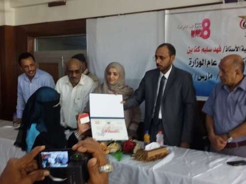 من جانبها قالت الاستاذة /منال أحمد دماج نائبة المدير العام للإدارة العامة لتنمية المرٱة الساحلية بديوان عام الوزارة أن هذا التكريم يجسد حرص وزارة الثروة السمكية ممثلة بوزيرها الاستاذ/ فهد سليم كفاين بالمرأة كونها عنصر فاعلا في البناء وشريكا اساسيا في التطوير وهذا التكريم يعزيز روح الانتماء والولاء الوظيفي من قبل المرأة لجميع مؤسساتها، مشددة بأنه على المرأة أن لا تتوقف ولا تستسلم للصعوبات بل يجب عليها أن تعانق العلم والعمل بكلتا يديها رغم أنف المجتمع والعادات والتقاليد وحتما ستصل يوما وستنجح فهذا الوطن محتاج لكل أمرأة فهي حجر الأساس والمدرسة الأولى.