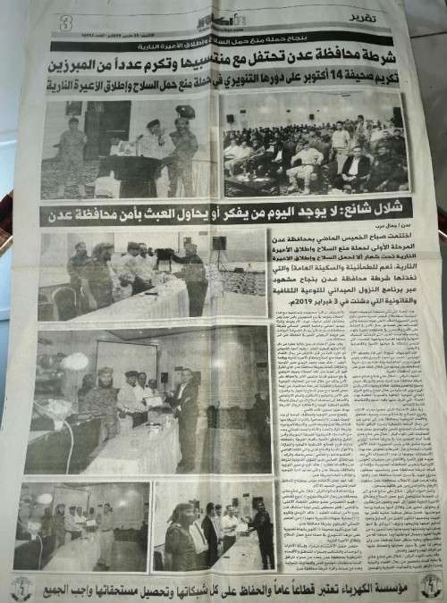 أفردت صحيفة 14 أكتوبر الرسمية اليومية تقريراً صحفياً مصوراً في صفحة كاملة لأبرز فعالية أمنية رسمية حدثت خلال الثلاثة الأشهر الماضية من العام الحالي 2019م.