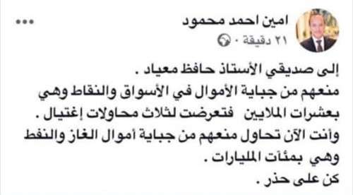 جاء ذلك عبر صفحته بالفيس بوك تعليقا على بيان محافظ البنك المركزي حافظ معياد .