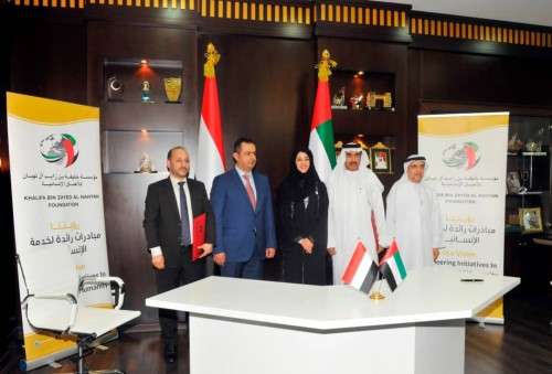 وقع الاتفاقية في المقر الرئيسي للمؤسسة في أبوظبي .. معالي أحمد جمعة الزعابي وزير شؤون المجلس الأعلى للاتحاد في وزارة شؤون الرئاسة نائب رئيس مؤسسة خليفة بن زايد آل نهيان للأعمال الإنسانية .. فيما وقعها عن الجانب اليمني معالي الدكتور نجيب العوج وزير التخطيط والتعاون الدولي اليمني وذلك بحضور معالي الدكتور معين عبدالملك رئيس الوزراء في الجمهورية اليمنية الشقيقة ومعالي ريم بنت إبراهيم الهاشمي وزيرة دولة لشؤون التعاون الدولي.