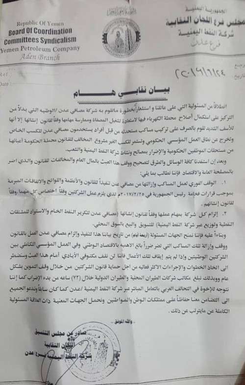 أصدرت نقابة عمال وموظفي شركة النفط اليمنية فرع عدن، اليوم الاثنين، بيانا هاما بخصوص التجاوزات القانونية التي تقوم بها شركة مصافي عدن.