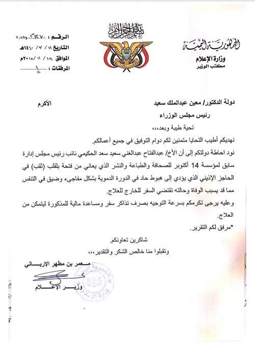 واستدل الحكيمي بما تعرض له شخصيا منذ توجيه وزير الإعلام معمر الارياني قبل أكثر من سبعة أشهر مذكرة عاجلة إلى رئيس الوزراء معين عبدالملك يطلب فيها صرف مساعدة مالية له للعلاج من مرض القلب في الخارج بحسب التقرير الطبي المرفق.