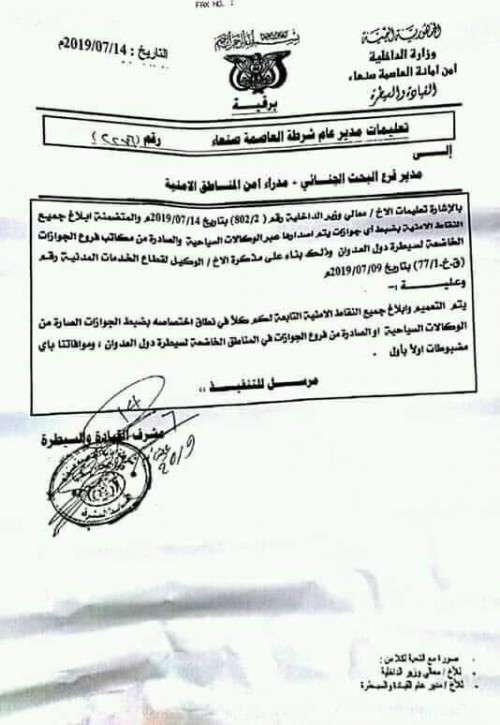 والوثيقة تحت مسمى "تعميم "صادرة ممايسمى بوزارة الداخلية لمليشيات الحوثي بصنعاء إلى نقاط التفتيش التابعة لها بمصادرة الجوازات التي تقوم الوكالات السياحية بإجراء معاملاتها في مناطق الشرعية والمناطق المحررة.