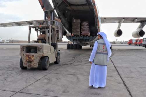 وكان في استقبالها في مطار عدن ممثل الهلال الأحمر الإماراتي "علي الكعبي"،.