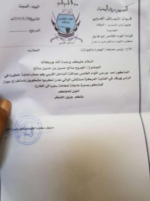 وهذه الحالة هي الحالة الثانية لجرحى العمالقة، التي تتوفى في مستشفيات عدن نتيجة تعثر حصولهم على جواز السفر ، حيث توفي الجريح حمادي معتوق يوم امس في احد مستشفيات عدن بعد تعثر حصوله على جواز سفر .
