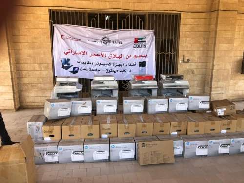 واستجاب الهلال الاحمر الاماراتي للعديد من المناشدات التي قدمتها بعض كليات جامعة عدن او المدارس حيث تم رفد كلية الحقوق - جامعة عدن 2018 ب 16 جهاز حاسوب و4 أجهزة لابتوب و 4 أجهزة اسكانر و4 الات طابعة. كما تم ايضا دعم كلية التمريض جامعة عدن 2019 بمسلتزمات طبية تعليمية ، وكلية العلوم في العام 2017 ب 200 كرسي لأربع قاعات و 2 أجهزة عرض و2 لابتوب اضافة الى 4 مكيفات 2 طن.
