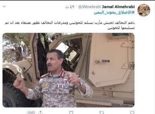 الناشط مصلح الصافئي قال : وهل توجد خيانة أقسى وأشد من قيام جبهات الإصلاح بالانسحاب من جبهات القتال وتسليم معسكراتهم والسلاح الحديث لحوثة إيران دون مقاومة تذكر !!! الا يوجد رجلا رشيد في المملكة يوقف هذا العبث ويعاقب شرعية الإخوان التي خانت الأمانة !