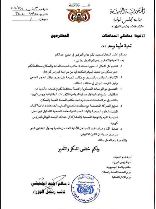 وجه نائب رئيس الوزراء رئيس اللجنة العليا للطوارئ الدكتور سالم احمد الخنبشي محافظي المحافظات باتخاذ عدد من الإجراءات الوقائية وتجهيز مراكز الحجر الصحي وفرق الترصد الوبائي في مختلف المنافذ .