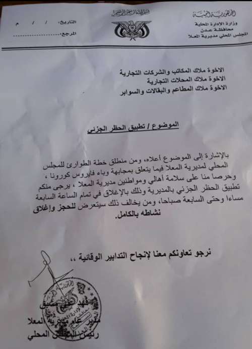 كما شملت القرارات بإصدار تعميم إلى كافة الشركات التجارية والمتاجر المتنوعة والبقالات بالمديرية بتنفيذ الحظر الجزئي من خلال إغلاق كافة محلاتهم وتقليص ساعات العمل إلى الساعة السابعة مساءاً على أن يتم إعادة فتحها في الساعة السابعة صباحاً، وإلزام الجميع باتخاذ التدابير الوقائية لمجابهة فايروس كورونا من خلال اللباس الوقائي وتعقيم وتطهير المكاتب والمحلات بشكل مستمر، منوهاً بتنفيذ العقوبات الصارمة وإغلاق نشاط المخالفين بالكامل.