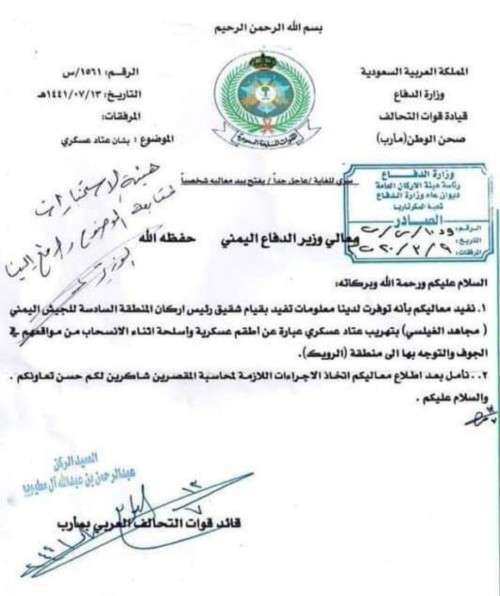 وذكر الزعيم القبلي الحسن علي أبكر، بأنه اطلع على وثيقة، موجهة من قائد قوات التحالف العربي في مأرب، إلى وزير الدفاع في حكومة الشرعية محمد المقدشي، يتهم فيها قيادات عسكرية عليا بنهب مخازن أسلحة للجيش.
