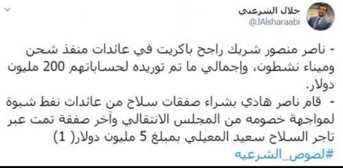وكتب الشرعبي عبر تغريدة له على "تويتر" ناصر منصور شريك راجح باكريت في عائدات منفذ شحن وميناء نشطون، وإجمالي ما تم توريده لحساباتهم 200 مليون دولار".