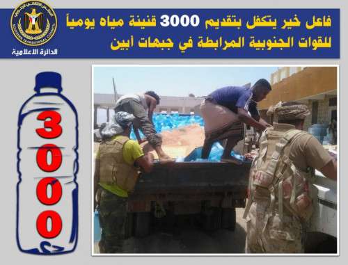 وأدلى القائم بعملية الاستلام وتوزيع كمية المياه على الجبهات عضو الجمعية الوطنية عبدالله عليان اليزيدي في تصريح مقتضب : لقد بدأنا باستلام كمية المياه منذ أيام وباشرنا بتوزيعها على أبطال قواتنا المسلحة الجنوبية المرابطة في منطقة الشيخ سالم”. وأوضح عليان ان رجل الخير تكفل بهذه الكمية يوميا حتى يتم استئصال واجتثاث الإرهاب وتطهير كافة المحافظات الجنوبية.