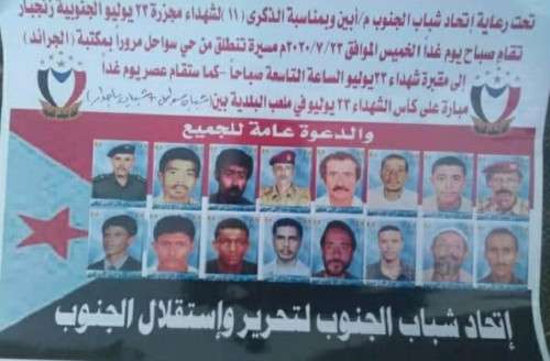 برعاية اتحاد شباب الجنوب بمحافظة أبين ستقام يوم غد الخميس فعاليتين صباحية ومسائية وذلك إحياء لذكرى شهداء مجزرة 23 يوليو والتي ارتكبتها قوات الاحتلال اليمني بحق أبناء أبين.