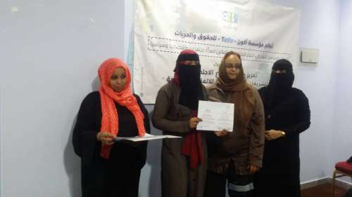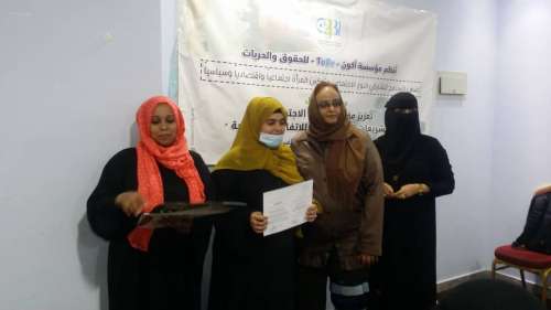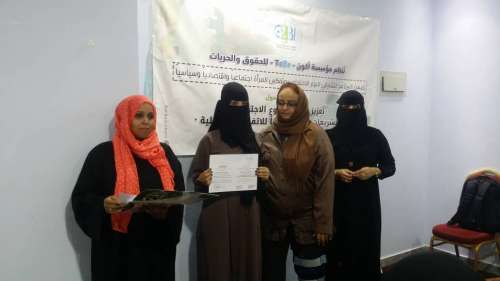 وأشارت" : إن المرأة اليمنية وخاصة في الأوضاع التي تعاني منها اليمن تفتقر إلى بعض المفاهيم من الاتفاقات الدولية .. لافته إلى الدور التي ستقوم به المتدربات دور كبير جدا مما يجب عليهم نقل وتوصيل رسالة للمجتمع وللمرأة اليمنية بالقضايا بمهنية أكثر في مواضيع ومفاهيم حول الاتفاقات حول حقوق الإنسان والتشريعات الوطنية المتعلقة بالمرأة والعنف القائم واليات الحماية والمواثيق الدولية ومهام عمل اللجنة الوطنية للمرأة .