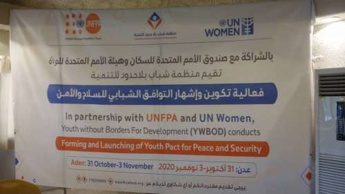 دشنت منظمة شباب بلا حدود للتنمية وهي منظمة محلية مهتمة بقضايا الشباب في اليمن؛ في "قاعة الخيمة بفندق كورال" في العاصمة المؤقتة عدن، فعالية " تكوين وإشهار التوافق الشبابي للسلام والأمن"، الثلاثاء ٣ نوفمبر٢٠٢٠، بمشاركة عدد من نشطاء وشباب وشابات منظمات المجتمع المدني ومبادرات شبابية.