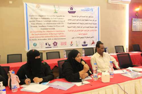 عقد " لقاء تشاوري حول تنفيذ الحق القانوني في منح المرأة جنسيتها لابنائها " في العاصمة عدن، تحت شعار "نحو المساواة في حق الجنسية" استمرت ليوم واحد بمشاركة ممثلي جهات الاختصاص وشخصيات قضائية والمنظمات النسوية وعدد من النساء المعنيات في الإستفادة من الحق القانوني في الجنسية.