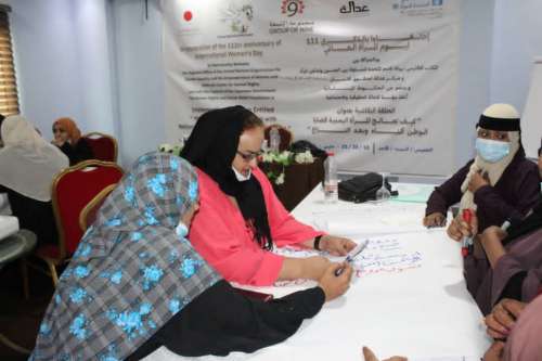 بمناسبة احتفاء بالذكرى "111" ليوم المرأة العالمي" نظمت مؤسسة الإغاثة الحقوقية والاجتماعية في قاعة المعلا بلازا بمديرية المعلا بالعاصمة عدن حلقة نقاشية بعنوان "كيف تعالج المرأة اليمنية قضايا الوطن إثناء وبعد النزاع " وبمشاركة عدد من النساء القياديات والتي تستمر خلال الفترة 18-21- مارس 2021.