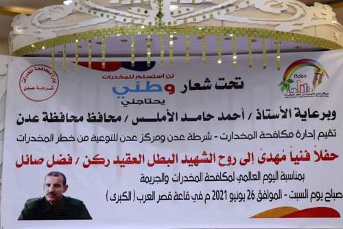أقام مركز عدن للتوعية من خطر المخدرات وادارة مكافحة المخدرات -عدن صباح اليوم السبت الموافق 26 يونيو 2021 حفلا فنيا وخطابيا .. مهدى الى روح الشهيد البطل فضل صائل المدير السابق لإدارة مكافحة المخدرات احتوى الحفل على فقرات مميزة عبارة عن عرض حالتين واقعيتين لشباب وقعوا ضحايا تعاطي المخدرات أوصلتهما إلى مصير كاد يدمر مستقبلها .