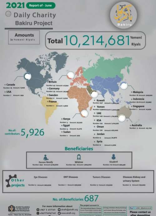 كما يمكن لغيرهم عبر التحويل لحسابات المؤسسة في البنوك ومحلات الصرافة .. مع كتابة إسم المشروع وأيام الصدقة في سند الإيداع أو التواصل مع إدارة المشروع عبر الواتساب والهاتف المخصص للمشروع : 967774767141 . https://alrafh.org/bakiru-jun21/