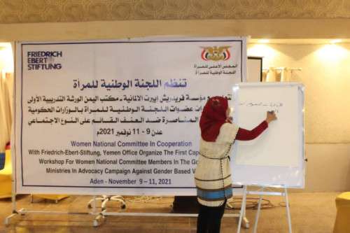يأتي ذلك بتنظيم اللجنة الوطنية للمرأة وبالتعاون مع مؤسسة فريدريش ايبرت الألمانية – مكتب اليمن ، والتي تستمر خلال الفترة 9-11-نوفمبر 2021م م/ عدن، بمشاركة عدد من عضوات اللجنة الوطنية للمرأة .