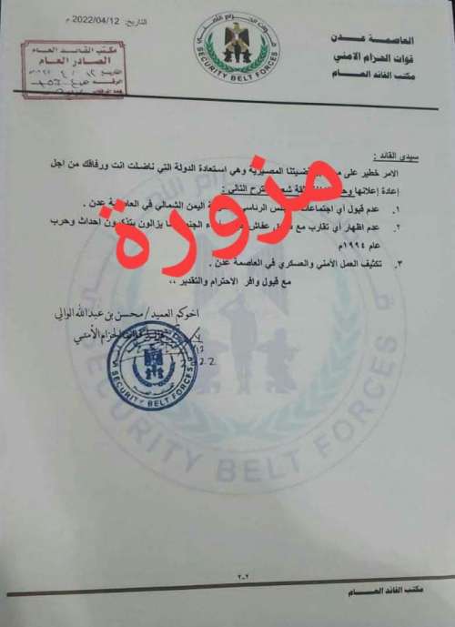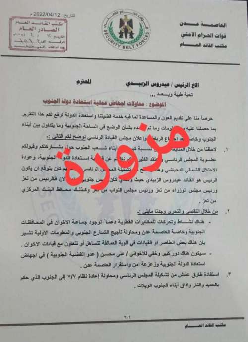 مشيراً أن أي وثيقة تصدر عن قيادة الحزام الأمني سيتم نشرها في المواقع الرسمية، (المركز الإعلامي لقوات الحزام الأمني، والموقع الرسمي للقوات المسلحة الجنوبية “درع الجنوب” ) وهي المواقع الإخبارية الرسمية.