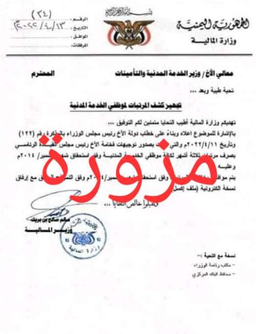 نفى مصدر مسؤول بديوان وزارة المالية في العاصمة المؤقتة عدن، صحة وثيقة مزورة بشأن صرف  مرتبات 3 أشهر لكافة موظفي الدولة.