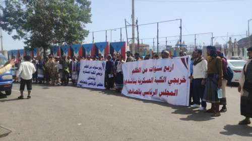 المشاركون في الوقفة الاحتجاجية رفعوا لافتات، كُتب عليها: "أربع سنواتٍ من الظلم.. خريجو الكلية العسكرية يناشدون المجلس الرئاسي إنصافهم".