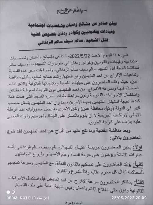 في هذا اليوم الاحد 22/5/2022م تداعى مشائخ واعيان وشخصيات اجتماعية وقيادات وقانونيين وكوادر ردفان الى منزل والد الشهيد/ سالم سيف سالم لمناقشة قضية قتل الشهيد سالم سيف سالم الردفاني، واجراءات سير هذه القضية وتداعيات الافراج عن احد المتهمين وهو المتهم/ رشاد صالح شائع، وكيل محافظة عدن، حيث وقف الحاضرون على حيثيات القضية وملابساتها القانونية والاجراءات المتخذة فيها وسرعة الافراج عن احد المتهمين دون التريث لمعرفة الحقائق واستكمال الاجراءات القانونية ودون مراعاة مشاعر اسرة الشهيد التي فقدت فلذة كبدها نتيجة استهتار المتهمين بحياة الاخرين سيما وان احد المتهمين يشغل منصب كبير في الدولة (وكيل محافظة عدن) وكان الاحرى به تحمل مسؤولياته منذ الوهلة الاولى لارتكاب الجريمة لا ان يقوم بالتستر على الجناة وتهريبهم وترك المجني عليه ينزف على قارعة الطريق.