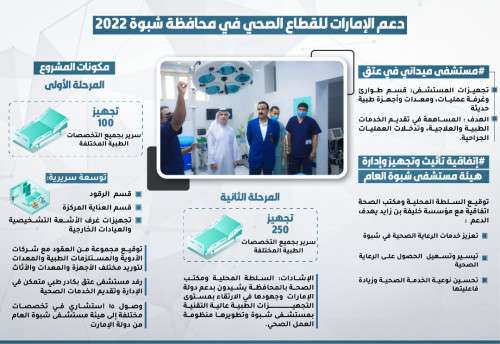 تواصل دولة الإمارات تقديم الدعم لقطاع الصحة في محافظة شبوة خلال العام 2022 حيث بدأ الدعم بإنشاء مستشفى ميداني في عتق تضمن المستشفى تجهيزات في قسم طوارئ وغرفة عمليات، ومعدات وأجهزة طبية حديثة وذلك بهدف المساهمة في تقديم الخدمات الطبية والعلاجية، وتدخلات العمليات الجراحية.