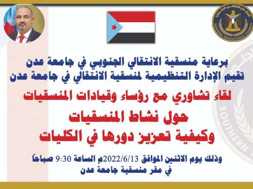 عقدت الإدارة التنظيمية في المنسقية العليا للمجلس الانتقالي الجنوبي في جامعة عدن، صباح اليوم الإثنين، لقاءً تشاورياً مع رؤساء وقيادات المنسقيات وكيفية تعزيز دورها في الكليات، وذلك برعاية المنسقية العليا للانتقالي في جامعة عدن، في مقر المنسقية بالعاصمة عدن.