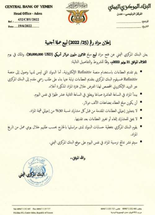 أعلن البنك المركزي اليمني عن فتح مزاد لبيع مبلغ ثلاثون مليون دولار أمريكي (30,000,000 USD)، وذلك في يوم الثلاثاء الموافق 21 يونيو 2022م، وفقًا للشروط والتفاصيل التالية: